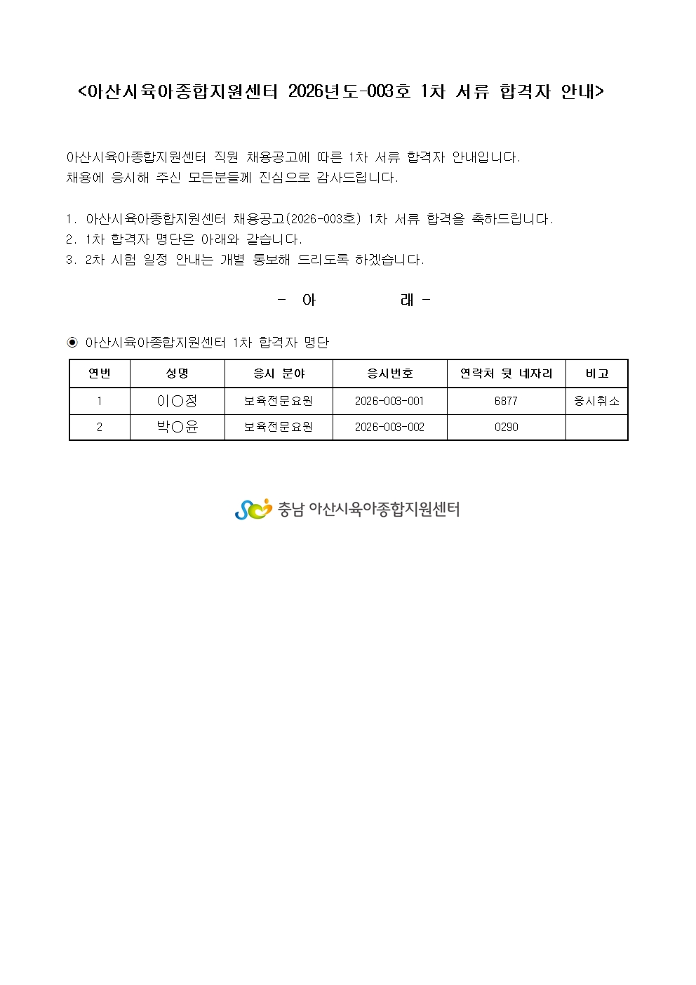 2026³âµµ 003È£ 1Â÷ ¼·ù ÇÕ°ÝÀÚ ¾È³»