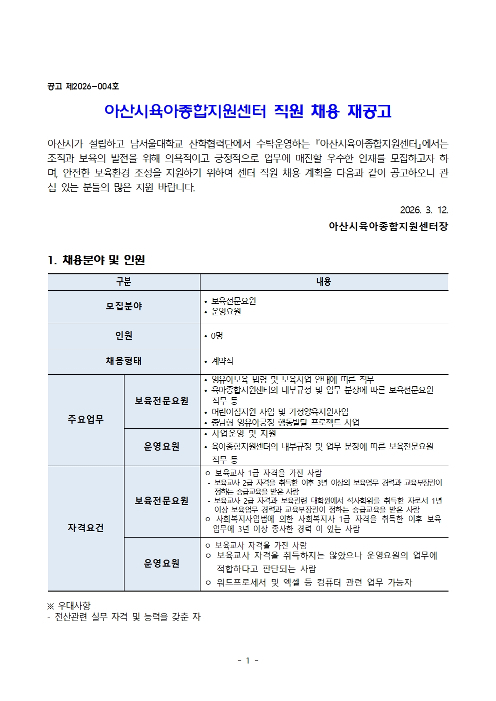 2026-051- 2026-004¾Æ»ê½ÃÀ°¾ÆÁ¾ÇÕÁö¿ø¼¾ÅÍ Á÷¿ø ä¿ë °ø°í¹®(2026.03.12.).pdf