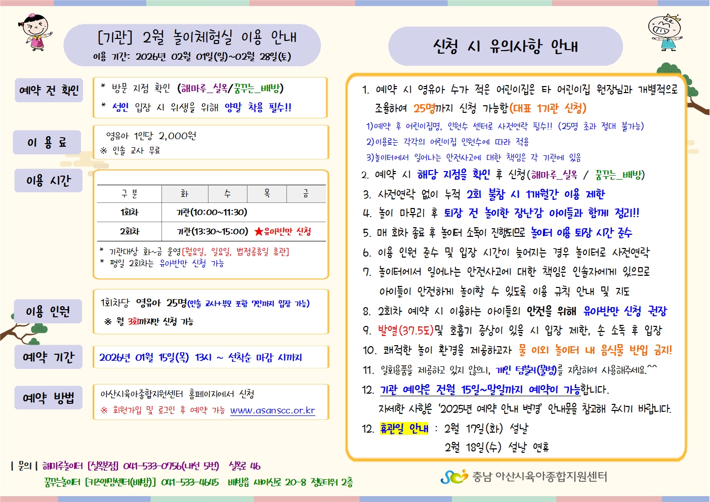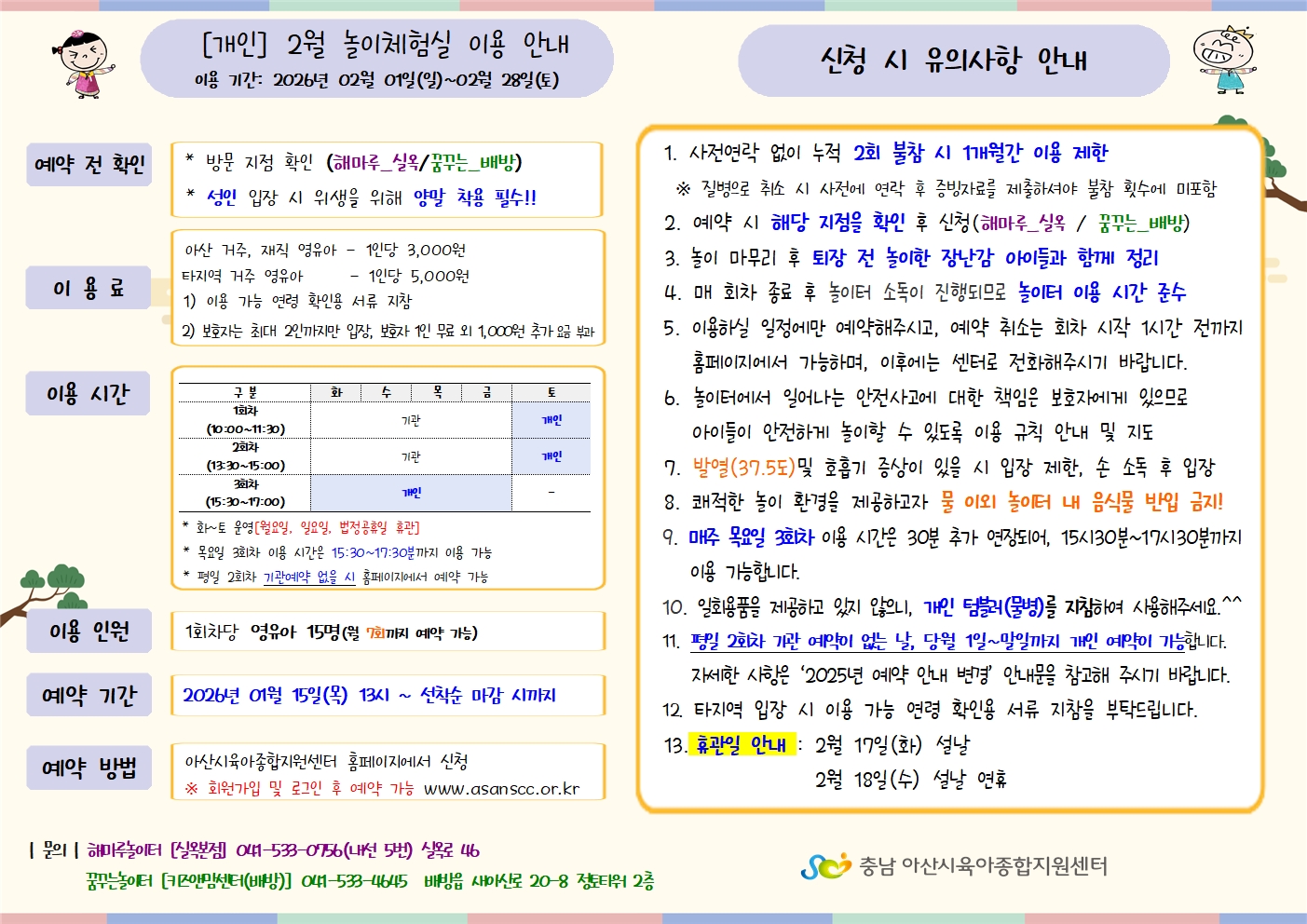 ¾È³çÇϼ¼¿ä. ¾Æ»ê½ÃÀ°¾ÆÁ¾ÇÕÁö¿ø¼¾ÅÍ ³îÀÌüÇè½Ç ´ã´çÀÚÀÔ´Ï´Ù. 2026³â 2¿ù ³îÀÌüÇè½Ç ÀÌ¿ë ¾È³» ÇØµå¸³´Ï´Ù. 1¿ù 15ÀÏ(¸ñ) ¿ÀÈÄ 1½ÃºÎÅÍ ¿¹¾àÀÌ °¡´ÉÇÏ¿À´Ï ¸¹Àº °ü½É°ú Âü¿© ºÎʵ右´Ï´Ù.^^ ¿¹¾à(Ŭ¸¯) - [ÇØ¸¶·ç³îÀÌÅÍ] [²Þ²Ù´Â³îÀÌÅÍ]