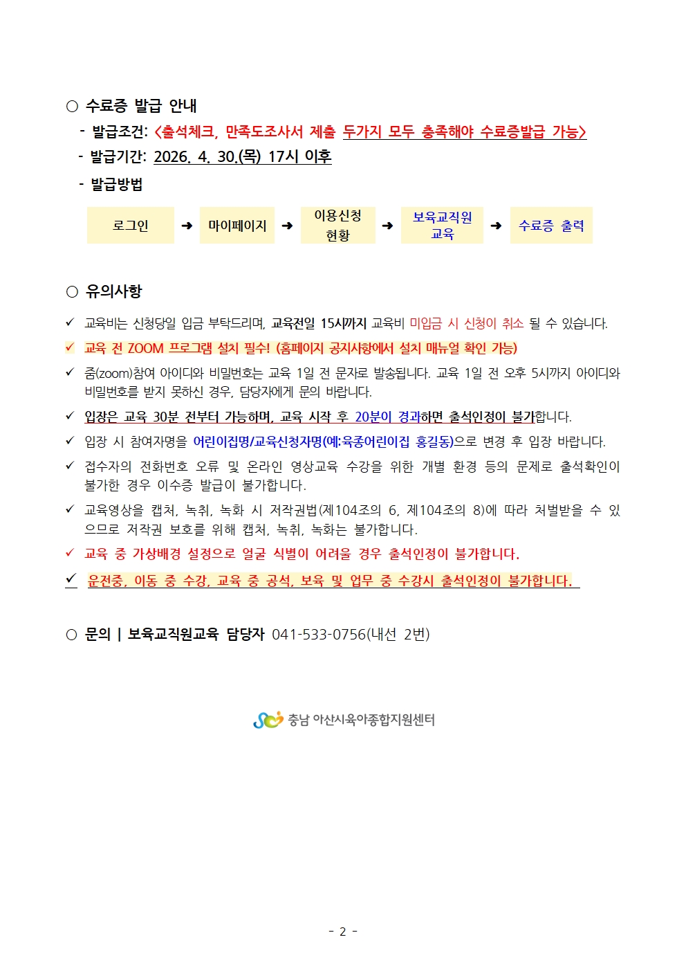 | ±âŸ»çÇ× | *±³À°½ÃÀÛ ÈÄ 20ºÐÀÌ °æ°úÇϸé Ãâ¼®ÀÎÁ¤ ºÒ°¡ *±³À°½Åû Àü ȸ¿ø°¡ÀÔ Á¤º¸ È®ÀÎ(¾î¸°ÀÌÁý¸í/ÀüȹøÈ£) *Ã⼮üũ+¸¸Á·µµÁ¶»ç ȸ½Å µÎ°¡Áö ¸ðµÎ ÃæÁ·µÇ¾î¾ß ¼ö·áÁõ ¹ß±Þ *ÁÜ ÇÁ·Î±×·¥ ±³À° Àü ¼³Ä¡ Çʼö |
