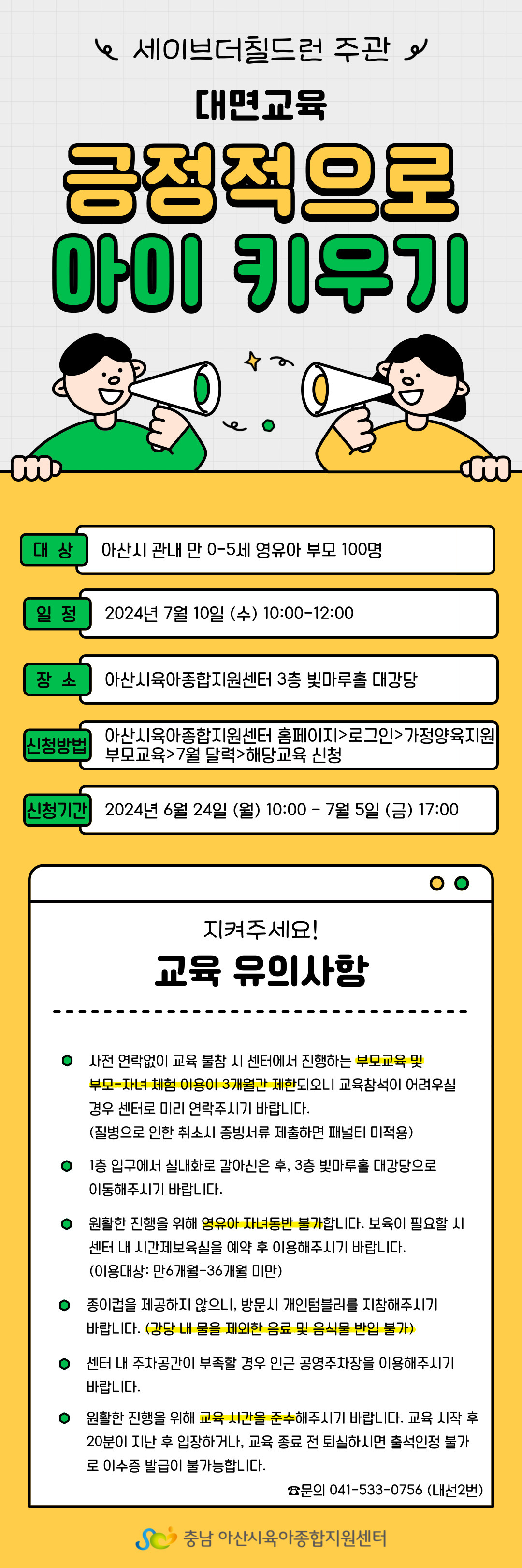 ±³À°½Åû½Ã À¯ÀÇ»çÇ× | * ½Åû Àü ¾È³»¹®À» ²À! È®ÀÎÇØÁÖ¼¼¿ä. * ±³À° ½ÃÀÛ ÈÄ 20ºÐÀÌ Áö³ª¸é Ãâ¼®ÀÎÁ¤ ºÒ°¡·Î À̼öÁõ ¹ß±ÞÀÌ ºÒ°¡ÇÕ´Ï´Ù.(±³À° Á¾·á Àü Åð½Çµµ µ¿ÀÏ) * ÀÚ³à µ¿¹ÝÀº ºÒ°¡ÇÕ´Ï´Ù. * »çÀü¿¬¶ô¾øÀÌ ±³À°´çÀÏ ºÒÂü ½Ã ¼¾ÅÍ¿¡¼ ÁøÇàÇÏ´Â ºÎ¸ð±³À° ¹× ºÎ¸ð-ÀÚ³àüÇè ÇÁ·Î±×·¥¿¡ 3°³¿ù°£ Âü¿© ºÒ°¡(Áúº´À¸·Î ºÒÂü ½Ã Áõºù¼·ù¸¦ Á¦ÃâÇÏ¼Å¾ß ÆÐ³ÎƼ ¹ÌÀû¿ë) *¿¸°¾î¸°ÀÌÁý ÁöÀÚü °¡Á¡ |