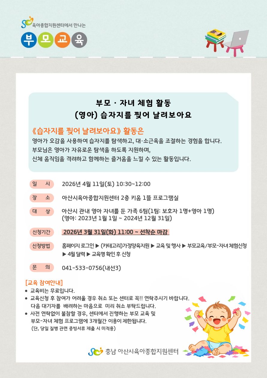 | ±âŸ»çÇ× | - ¾Æ»ê½Ã °ü³» °ÅÁÖÀÚ ¶Ç´Â ¾Æ»ê½Ã ¼ÒÀç Á÷Àå ÀçÁ÷ ÁßÀÎ °¡Á¤¸¸ ½Åû °¡´ÉÇÕ´Ï´Ù. - Âü¿© ÀοøÀ» ÁؼöÇØÁÖ¼¼¿ä. (1ÆÀ=¿µ¾Æ1¸í+¾çÀ°ÀÚ1¸í) - üÇè Àü ÀÏ 6½Ã ÀÌÈÄ Ãë¼Ò ¹× »çÀü¿¬¶ô¾øÀÌ ´çÀÏ ºÒÂü½Ã ¼¾ÅÍ¿¡¼ ÁøÇàÇÏ´Â ºÎ¸ð±³À° ¹× ºÎ¸ð-ÀÚ³à üÇèÇÁ·Î±×·¥ ÀÌ¿ëÀÌ 3°³¿ù°£ Á¦Çѵ˴ϴÙ. (´çÀÏ Áúº´ °ü·Ã ºÒÂüÀ¸·Î ÁõºùÀÚ·á Á¦Ã⠽à ÆÐ³ÎƼ ¹ÌÀû¿ë) |